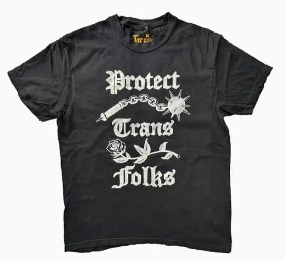 Image description: A black short sleeve shirt with the statement “Protect Trans Folks� with a rose and a flail between the letters, all in a white gothic font.