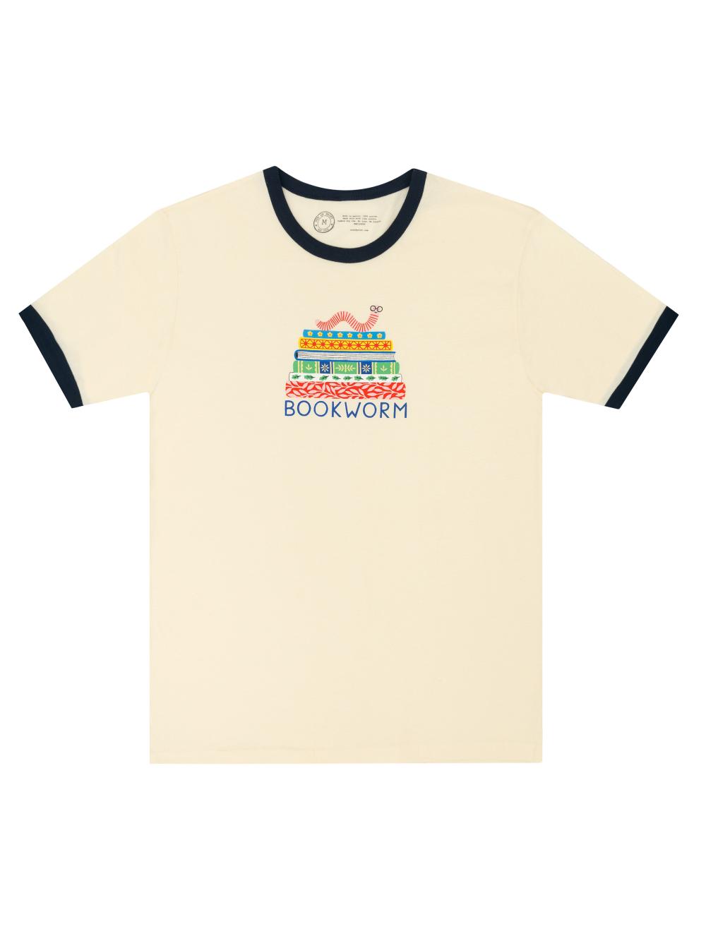 Bookworm Unisex Ringer T-ShirtBookworm unisex ringer t-shirtProduct Details100% cotton crew neck ringer teeColor: natural/navyIllustrated by Holly MaguireSize & FitAvailable in sizes XS-3XL