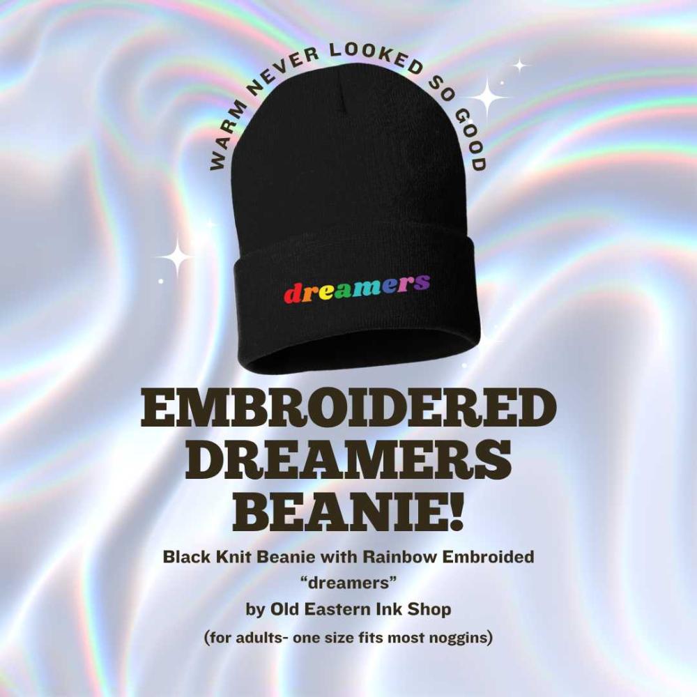 New from our friends at Old Eastern Ink Shop- embroidered knit beanies! These black knit beanies are embroidered with "dreamers" in rainbow thread. These are adult sized beanies (one size fits most noggins)!