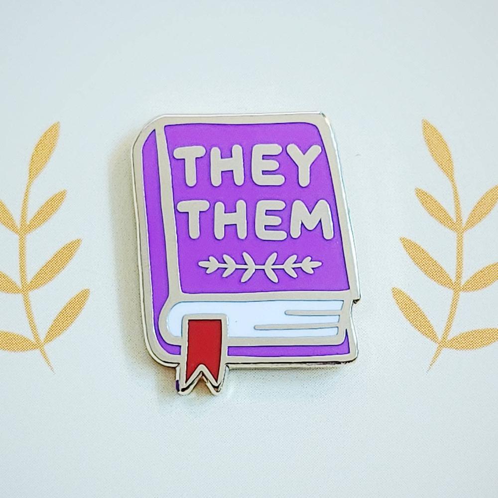 Hard enamel purple book pin with they/them pronouns, to share your pronouns in a cute and subtle way.